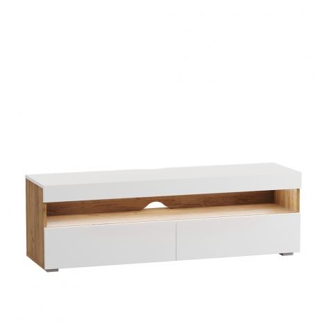 Тумбы под ТВ может быть укомплектована подсветкой, которая эффектно смотрится в интерьере и подчёркивает широкую нишу, свободную от перегородок.