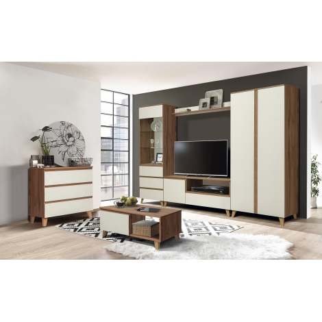 Коллекция выполнена в цвете дуб вотан, что позволило дополнительно подчеркнуть современный тренд на аутентичность, отличается простотой и эргономичностью, удобством в эксплуатации, вместительностью и функциональностью. Идеальный современный вариант с облегченным решением на высоких ножках – они помогут визуально расширить пространство комнаты, а также это удобство для использования робот-пылесоса